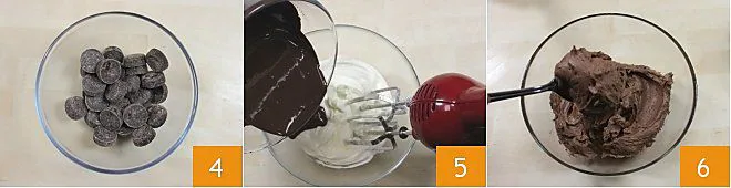 Now prepare the chocolate cream: pour the dark chocolate chips into a bowl and place the bowl inside a saucepan filled with water halfway up. Heat the chocolate over a bain-marie, keeping the heat very low until it is completely melted 4. Meanwhile, pour the cream cheese and 25 g of powdered sugar into a bowl and whip until a frothy mixture is obtained. At this point, add the melted dark chocolate after allowing it to cool slightly 5 and mix everything together 6.