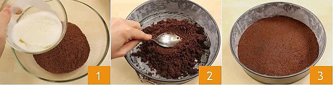 To prepare the Black Forest cheesecake, start by making the base: place the cocoa cookies in a food processor, finely chop them, and transfer them to a bowl. Melt the butter in a saucepan or microwave and gradually add it to the cookies 1, mixing well to combine. Butter a springform cake pan with a 9-inch diameter and line it with parchment paper (to see how, check here our Cooking School: how to line a cake pan with parchment paper). Pour the crumbled cookies into the pan and press down with the back of a spoon to compact the cookie base 2. Chill the base 3 in the refrigerator for half an hour or in the freezer for 15 minutes.