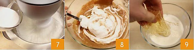 Beat the egg whites with the remaining sugar (50 g) until stiff 7 and, when they are firm, add them to the chocolate cream, stirring with a spatula from top to bottom to avoid deflating the egg whites 8. Soften 12 g of gelatin in cold water for 10 minutes, squeeze it, and dissolve it in 2 tablespoons of warm cream 9. If you want to learn more about using gelatin, here our Cooking School: how to use gelatin.