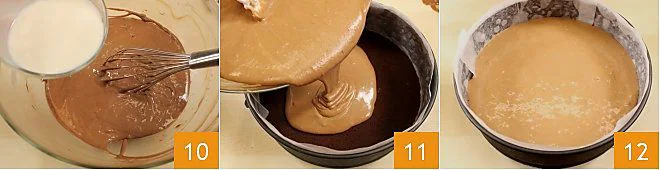 Once the cream is at room temperature, add it to the chocolate cream 10 and mix until a homogeneous mixture is obtained. Take the cookie base, which will be firm, and pour half of the chocolate cream over it 11, spreading it evenly 12. Leave everything to rest in the refrigerator for at least half an hour; cover the remaining chocolate cream with plastic wrap and store it in a cool place (not in the refrigerator, otherwise it will firm up too much).