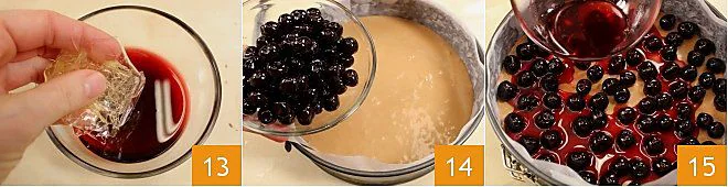 Meanwhile, prepare the cherry sauce: drain the cherries well and set aside 100 ml of the syrup. Soften the gelatin in cold water for 10 minutes, squeeze it well, and dissolve it in the syrup 13. After the resting time, take the cheesecake and pour the cherries 14 and the syrup with the gelatin over it 15. Place the cake back in the refrigerator to firm up for at least half an hour.
