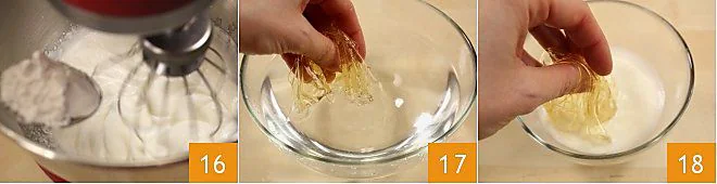 In the meantime, work on the cream layer: in a stand mixer with a whisk attachment or with an electric beater, whip the cream (leaving aside 1-2 tablespoons to dissolve the gelatin) with 1 tablespoon of powdered sugar 16; set aside a couple of tablespoons of whipped cream for the final decoration. Soften 8 g of gelatin in cold water, squeeze it 17, and dissolve it in 1-2 tablespoons of warm cream 18.