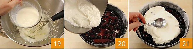 Once the cream with gelatin is at room temperature, incorporate it into the whipped cream 18 and mix. Take the cake and now form the cream layer: pour the cream over the cherries 20 and spread it evenly with the back of a spoon 21. Place the cheesecake in the refrigerator again for half an hour.