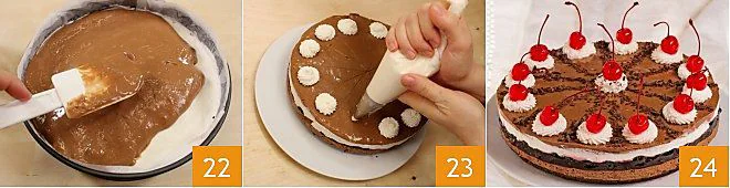 After the necessary time has passed, pour the remaining chocolate cream over the base 22, forming an even layer with a spatula. Place the cheesecake to firm up in the refrigerator for the last time, for another half hour. After this time, your Black Forest cheesecake is ready to be garnished: pipe dollops of whipped cream using a pastry bag with a star nozzle 23 and decorate as you like with cherries in syrup or fresh and chocolate sprinkles 34.