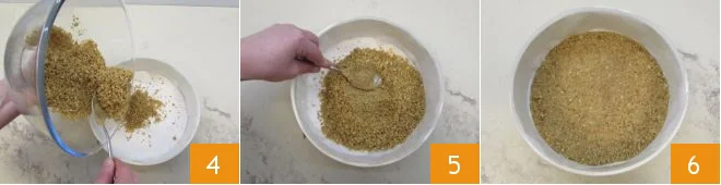 To prepare the light cheesecake, start by preparing the base: put the whole wheat cookies in a mixer 1, then finely chop them 2. Place the chopped cookies in a bowl. Now melt the butter in a small pan; gradually add the melted butter to the bowl with the chopped cookies 3 and mix well until you get a sandy mixture.