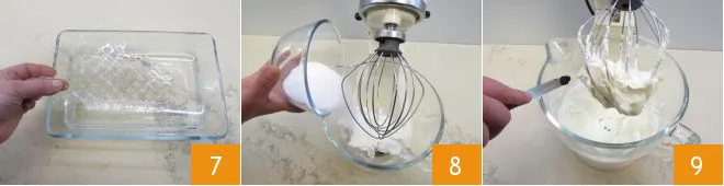 Incorporate the low-fat yogurt into the mixture 10 and continue mixing with the mixers. Meanwhile, the sheet gelatin will have softened well. Melt it in a small pan with 2 tbsp of hot water 11 and when it is completely melted, incorporate it into the cheese and yogurt mixture 12. Mix all the ingredients well with a hand mixer to obtain a smooth and creamy mixture.