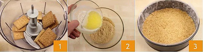 To prepare the marbled cheesecake, start by setting up the base: put the cookies in the mixer 1 and chop them finely. Melt the butter in a saucepan; in the meantime, place the chopped cookies in a bowl and gradually add the melted butter 2, mixing everything together well. Butter a 9-inch springform pan; cut a circle of parchment paper the same diameter as the base of the pan and two strips the same height as the sides, then line the pan itself. For more details, consult the lining a cake pan with parchment paper guide from the Cooking School. Pour the crumbled cookies into the parchment-lined pan and use a spoon to compact the cookie base 3. Chill the mixture in the refrigerator for half an hour or in the freezer for about ten minutes.