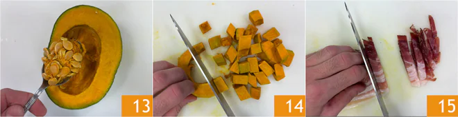 Clean the pumpkin of seeds and internal fibers 13, then remove the skin and cut 10.5 oz of pulp into evenly sized cubes 14. Cut the speck into strips 15.