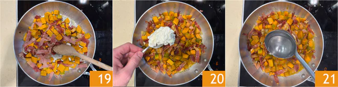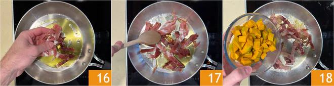 Heat the oil in a pan, add the speck 16, and sauté over low heat for a couple of minutes 17, then add the pumpkin 18.