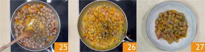 Cook over medium heat for 10-15 minutes, stirring occasionally 19. In the meantime, bring a pot of salted water to a boil to cook the gnocchi. When the pumpkin becomes soft, lower the heat and add the gorgonzola 20, then add a ladle of hot water 21. Mix well to combine.