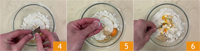 Add the nutmeg 4 and salt 5, then mix with a spoon 6.