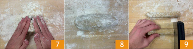 Transfer the mixture onto a work surface dusted with chestnut flour and continue to work it 7 until you obtain a soft, homogeneous, and slightly sticky dough 8. Divide the dough into smaller portions 9.
