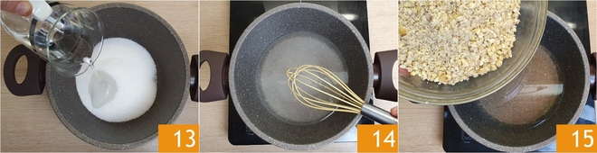 In a saucepan, pour the sugar and water 13 and bring to a boil while stirring with a whisk 14. Once the sugar has dissolved, add the blended chestnuts 15.