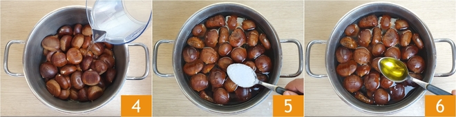 Transfer the scored chestnuts into a pot and cover with cold water 4, add the coarse salt 5 and the oil 6.