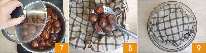 Cook with the lid on at medium heat for 30 minutes from the boiling point 7. Once cooked, drain the chestnuts on a clean, damp cloth 8, wrap them well and let them rest for about ten minutes 9.