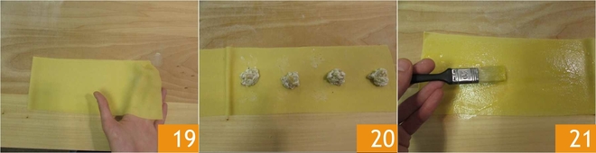and fold it in half 19. Then unfold it, this way you will understand which half to fill and which to fold over the filling. Arrange small heaps of filling on the pasta in a row, spacing them apart 20, brush the side of the pasta without filling with the egg 21