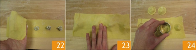 and fold the pasta to cover the filling 22, trying to match the two halves well. Press with your fingers to release any air 23. At this point, use a 1.2-inch cutter to give the filling a round shape, pressing lightly, then use a 2.8-inch one to cut out your ravioli 34.