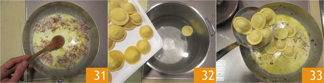 and mix well until the cheese melts 31. Cook the ravioli in boiling, salted water 32 for 3-4 minutes. Turn the heat back on under the sauce pan and drain the ravioli directly into it 33. Add some cooking water if necessary and toss until creamy.