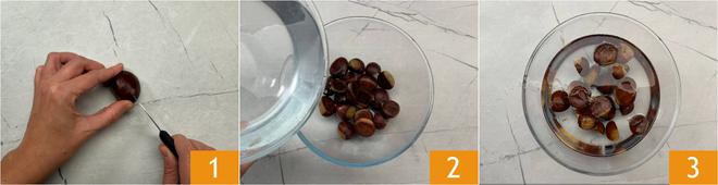 To prepare the chestnuts in the pan, first make a cross-cut on the top of the chestnuts 1. Place them in a bowl, cover them with cold water 2, and let them soak for 15 minutes 3.