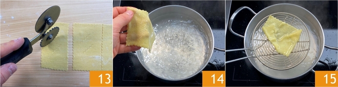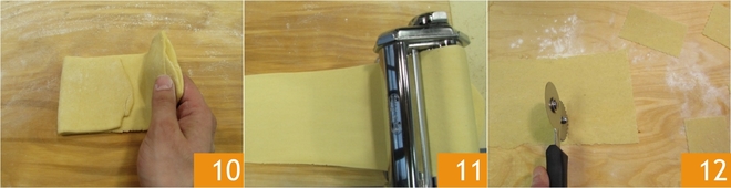 Fold the short sides of the dough strip towards the center 10, then roll it out again, gradually decreasing the thickness of the rollers until you reach about 1/16 inch 11. Proceed this way to roll out all the sheets, then let them rest for a few minutes. Trim the edges with a fluted wheel, then cut rectangles of about 4x2.5 inches 12.