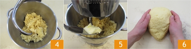 At this point, replace the paddle with the dough hook 4, then add the seeds from the vanilla bean and the softened butter 5. Continue kneading for 10 minutes until you get a smooth, firm but malleable dough. If necessary, you can add 5-10 g of water. Transfer the dough to a work surface and quickly shape it into a ball 6.
