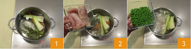 To prepare chicken and pea croquettes, start by placing all the vegetables and rosemary in a pot with plenty of cold water 1. As soon as the water comes to a simmer, add the chicken breast 2 and let it simmer for 10-12 minutes 2. Then add the peas 3 and let them cook for about 5 minutes.