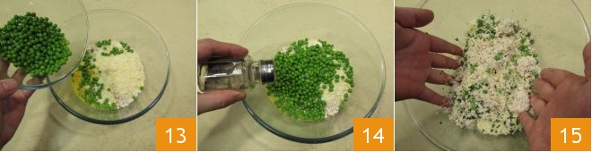 Add the peas you set aside 13, adjust the salt and pepper 14, and start mixing gently, keeping the peas intact, with all the ingredients 15.