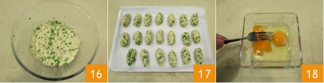 Get a compact dough 16 and proceed to form the croquettes 17: just take some dough and shape it between your hands to get a roll about 2-2.5 inches long. As you go, place the croquettes on a tray with parchment paper. In a bowl, crack the eggs and beat them quickly with a fork 18