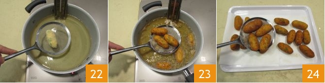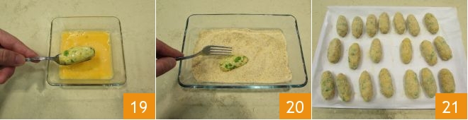 and dip one croquette at a time 19. Pick it up with a fork and roll it in the breadcrumbs 20: place your breaded croquettes on the same tray 21.