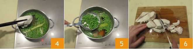 Drain the chicken, setting it on a cutting board 4, and then drain the peas, keeping them aside 5. Cut the breast into pieces 6
