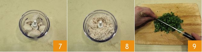 and place it in a blender 7 to crumble it 8 and transfer it to a bowl. Then proceed to chop the parsley with a knife, making it very fine 9