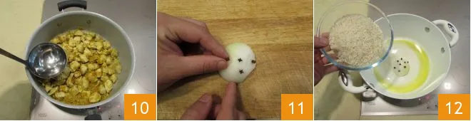 Add a ladle of hot water 10 and let it cook for about 10 minutes. In the meantime, start cooking the basmati rice. Insert the cloves into the sides of a half onion 11, this way they won't scatter during cooking and will be easy to remove. Place the onion in a pan with the oil. Let it sauté for a couple of minutes, then add the basmati rice 12.