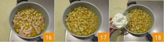 Add the shrimp 16 and cook for about 2 minutes 17, stirring occasionally. Then add the Greek yogurt 18