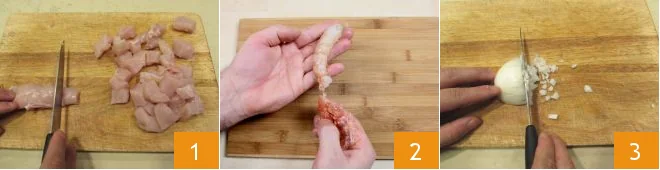 To prepare the chicken and shrimp curry with basmati rice, take the chicken breast and cut it into cubes, about 1 inch 1. Shell the shrimp tails 2, if you prefer, you can also remove the intestine with a toothpick, pulling it out from the back. Store the shrimp tails in the refrigerator until ready to use. Next, peel the onion and finely chop it 3;