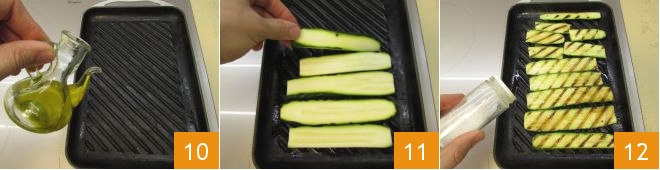 Now heat a grill well, brush it with a little oil 10, then lay the zucchini slices on it 11 and grill them on both sides, seasoning with salt to taste 12.
