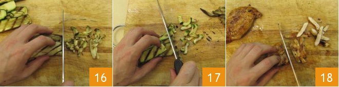 Once grilled, cut the zucchinis 16, eggplants 17, and chicken slices into strips about 0.8 inches long 18.