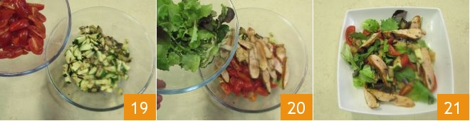 Let the grilled vegetables cool slightly, then transfer them to a bowl, add the cherry tomatoes 19, the chicken, and the mixed salad greens, which have been previously washed and dried 20, then mix everything well and transfer to plates: your chicken and zucchini salad is ready to be served 21!