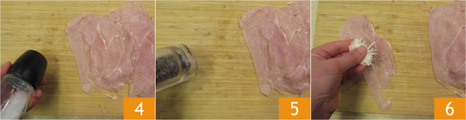 Take a slice of chicken, season with salt 4 and pepper on both sides 5. Stuff the center with about 0.18 oz of Pecorino and a sprinkle of oregano 6.