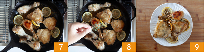 Cook for another 5 minutes 7. Enhance the flavor with a few leaves of thyme. Serve the chicken in a pan while it's hot 9.