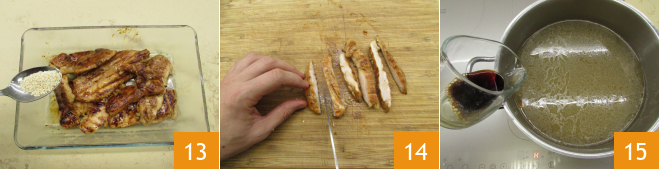 Sprinkle the chicken with sesame seeds 13 and cut into thin strips 14. At this point, only the cooking of the pasta is missing: add the soy sauce 15 to the broth from which you have removed the chicken and other ingredients.