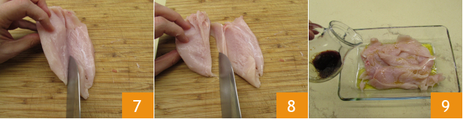Move on to the chicken breast: after cleaning off any tendons and the central bone, cut it 7 into thin slices 8. Place them in a container and season with soy sauce 9,