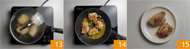 Cover with a lid 13 and cook for 10 minutes over low heat. Remove the lid, increase the heat, and continue cooking for a few more minutes, just long enough for the sauce to dry 14. Your chicken rolls in a pan are ready to be served 15.