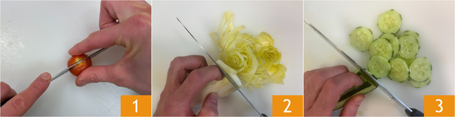 To prepare the chicken salad, start with the vegetables: wash and halve the cherry tomatoes 1, then clean the Belgian endive and slice it thinly 2. Peel the cucumber and cut it into thin slices 3.