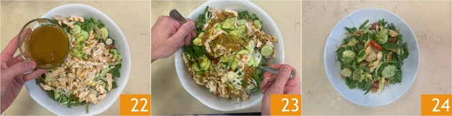 Dress with the dressing 22 and mix carefully to distribute all flavors well 23. Serve your chicken salad immediately 34!