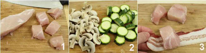 Cut the chicken breast into 1-inch cubes and make 34 cubes 1. Wash the zucchini, remove the ends, and cut them into 0.5-inch thick slices, making 34 rounds. Wash and cut the mushrooms into 0.5-inch thick slices as well 2, making 34 slices. Break the rosemary into 34 small sprigs. Wrap each chicken cube in a slice of bacon 3,
