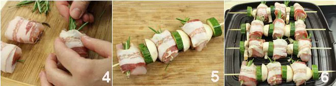 then insert a sprig of rosemary between the bacon and the chicken 4; skewer the cube onto the skewer. After it, also skewer a round of zucchini and a slice of mushroom, then again a bacon-covered cube, zucchini, and mushroom until the skewer is filled with 3 sets of ingredients 5. Prepare all 8 chicken skewers in the same way. Now, take a large grill or non-stick pan, heat it well, and then place the chicken skewers on it 6. Do not cook at too high a temperature, but let the bacon gradually brown, allowing the chicken to cook in its own fat; turn the chicken skewers on all sides for about 15-20 minutes. Serve the chicken skewers immediately.