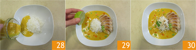 Everything is ready to plate: place the rice in the center of the plate and pour the soup around it 28, then sprinkle the vegetables and place the chicken on the soup. Season with lime juice and place sesame seeds and peanuts on the rice. Your chicken soup with basmati rice is ready to be served.