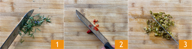 To prepare the chicken stew, first finely chop the rosemary 1, chili pepper 2, and olives 3 with a knife.