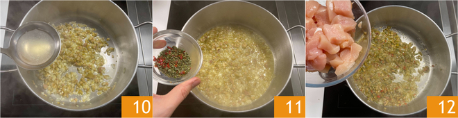 Moisten with a bit of broth 10 and then add the thyme, rosemary, and chili pepper 11. Stew for a few minutes then add the chicken breast to the pot 12. Try to brown the chicken chunks on all sides.