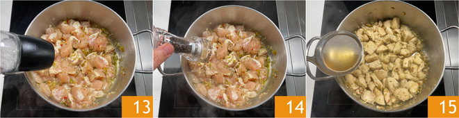 Adjust with salt 13 and pepper 14. After 10 minutes, cover with the broth 15.